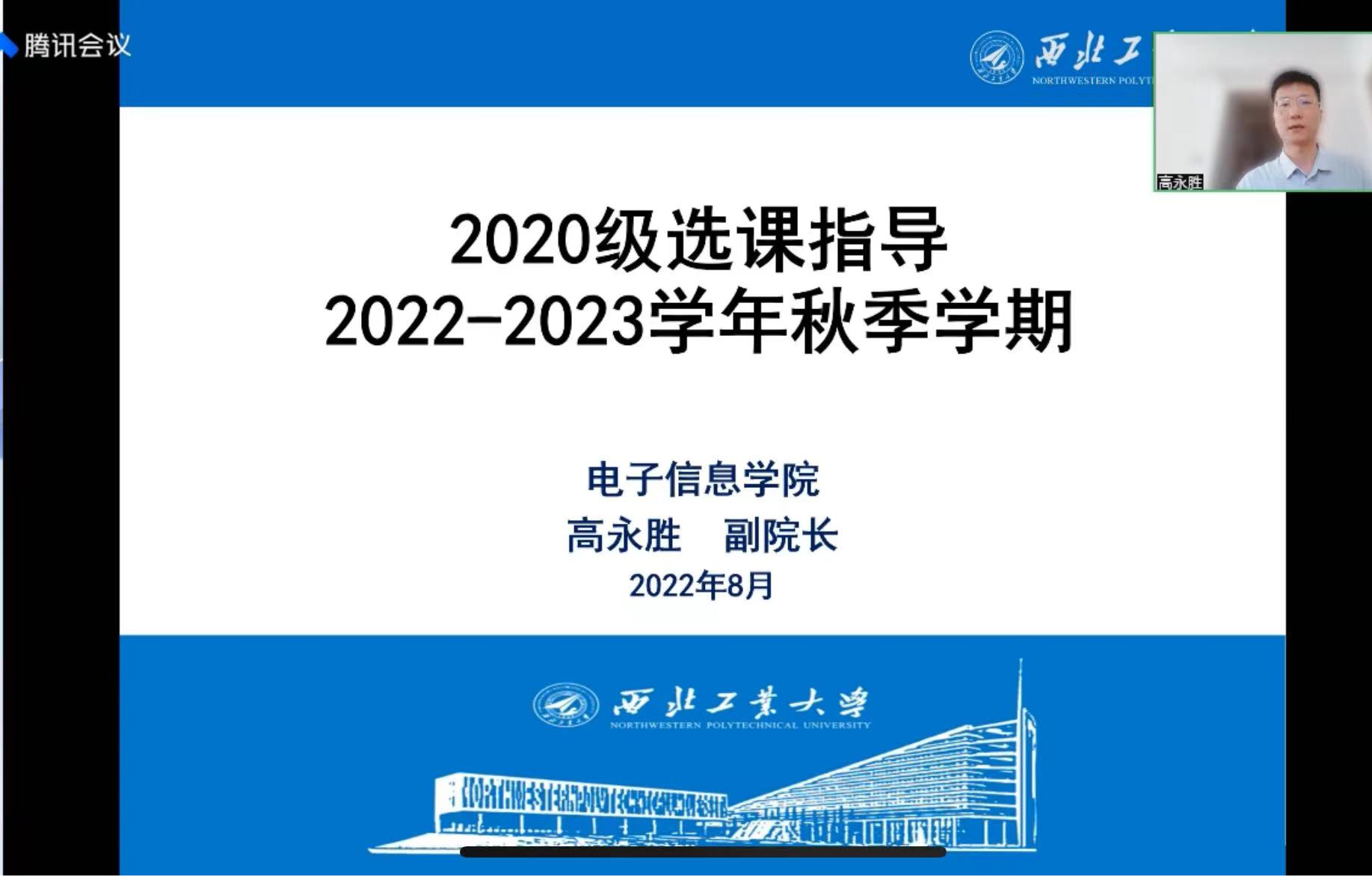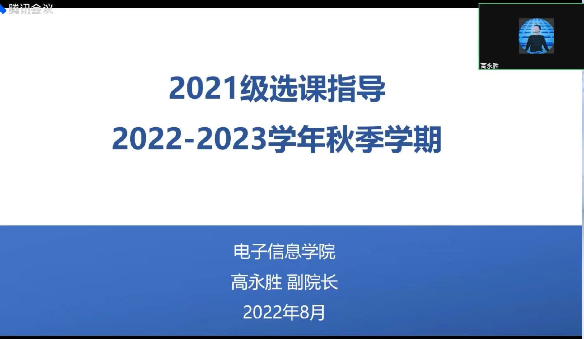 2022-2023学年秋季学期本科生选课即将开始,为帮助学生更深入地理解电子信息类专业的培养方案和课程体系,在完全学分制下更好地完成自主选课,77779193永利官网集团于8月14日上午,面向2020级和2021级本科生线上召开了2022-2023学年秋季学期选课指导会。学院副院长高永胜,专业综合设计类课程任课教师丁君、粟嘉、李枭扬,本科教学秘书何可、杨瑾,以及2020级和2021级电子信息类专业本科生参加了本次会议。会议由本科教学秘书杨瑾主持。