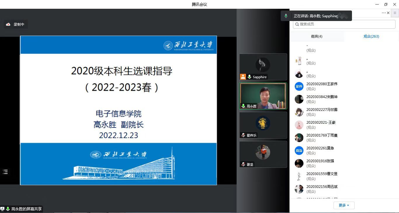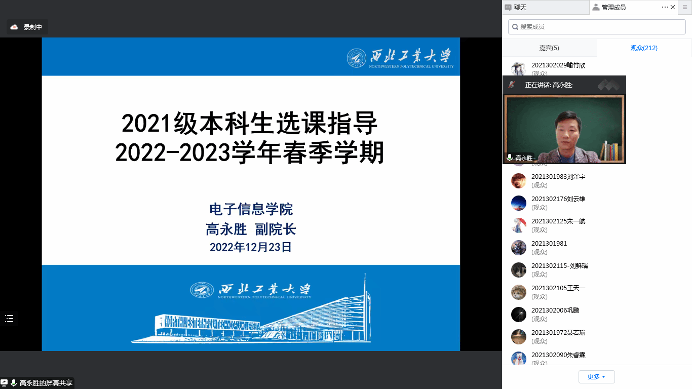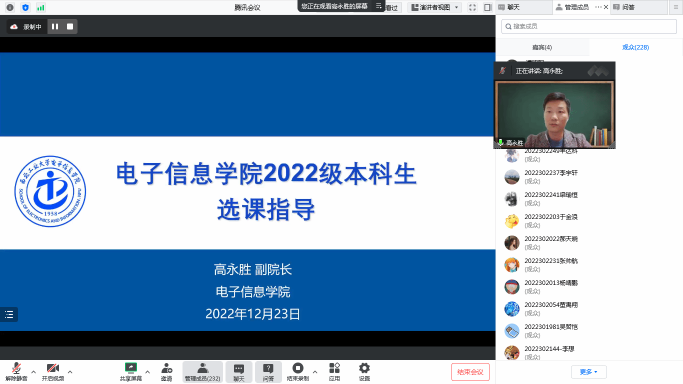 高永胜结合电子信息类专业的总体情况,为各年级学生详细解读了培养方案中各模块的学分要求、课程体系设置,并给出了2022-2023学年春季学期选课建议。高永胜指出,学院一直以来持续推进一流专业和一流课程建设,着力打造一流教学资源,希望同学们可以充分利用学校和学院的资源和平台,结合自身个性化发展需求,做好学业规划,学有所成。最后他嘱咐同学们特殊时期要加强自我防护,注意身体健康,劳逸结合,安排好个人学习和生活,有问题和困难多与辅导员和班主任沟通联系。