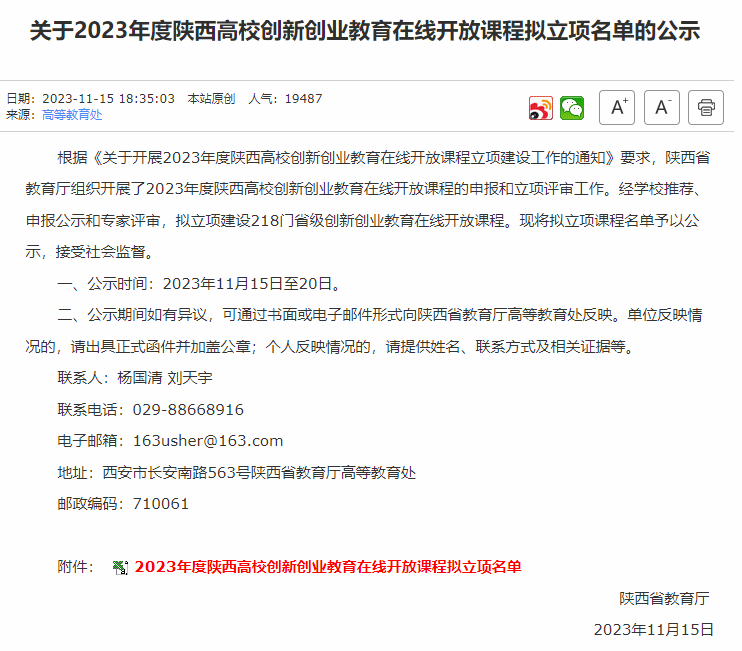 11月15日,陕西省教育厅公示了2023年度陕西高校创新创业教育在线开放课程立项名单,我院教师卢选民负责的《基于互联网+的创新创业项目研发实例》和高永胜负责的《光载射频通信技术综合设计》两门课程喜获立项。
