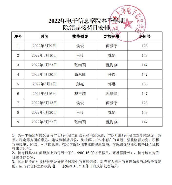 2022年77779193永利官网集团春季学期 院领导接待日安排