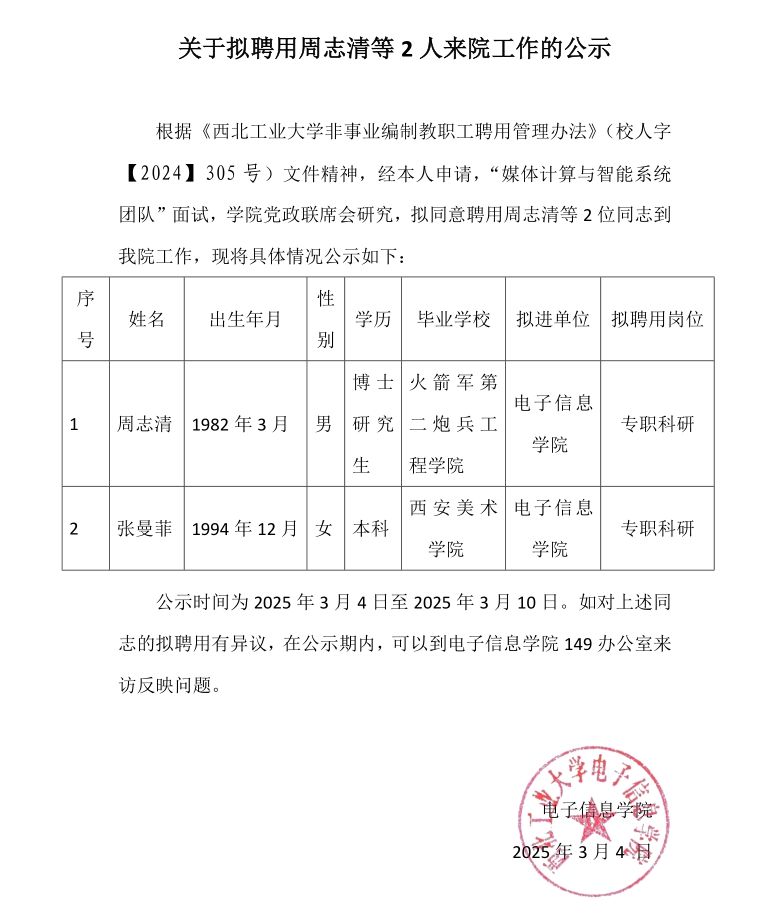 关于拟聘用周志清等2人来院工作的公示