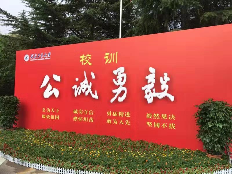 校训的“公”“诚”“勇”“毅”屹立于校门口