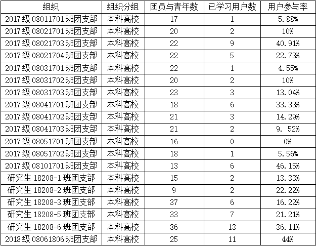 然而,本科2017级、研究生级仍有许多班级完成率低于50%,希望这些班级在之后的学习中能够提高学习积极性,向完成率较高的团支部汲取经验,按时完成学习任务。