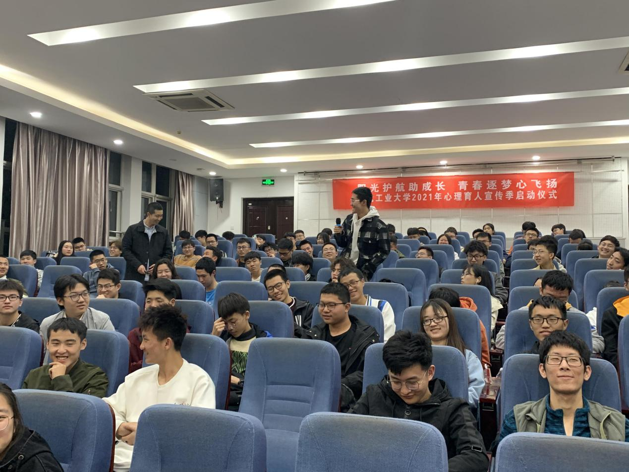 启动仪式的最后,由刘欣老师宣布永利集团2021年心理育人宣传季活动正式开始。本届心理育人季的首场讲座拉开序幕,由陕西省人民医院心理科主治医师宋东峰老师带来《追梦的你,幸福在哪里》主题讲座。宋东峰从不同的角度向讲述了幸福是什么,并且从心理学的角度介绍了什么是幸福,如何获得幸福感,鼓励大学生应当培养良好习惯,提升抗压能力,适当锻炼等,都有助于提高幸福感。宋东峰以诙谐幽默的语言和积极的现场互动,为大家介绍了正念减压的方法,并带领大家完成了一次“催眠”练习,缓解了大家的紧张感和疲惫感,让大家沉浸在这场生动的讲座中。宋东峰老师建议,要获得幸福,就要学会包括家庭、师生、同窗之间的沟通,以此释放自己的心理压力,获取情感共鸣。