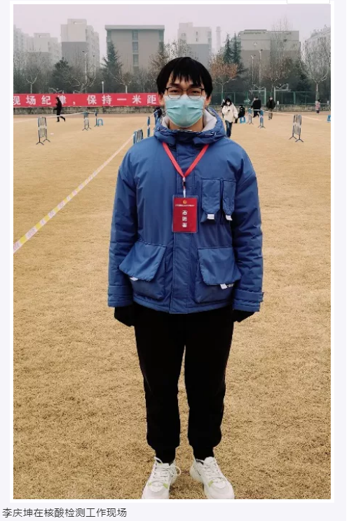 李庆坤,77779193永利官网集团研究生,同时是一名发展对象。在本次防疫工作中,他积极参与核酸检测志愿工作,在室外零下的环境中连续工作了四个小时,最终圆满完成了核酸检测志愿者的工作。