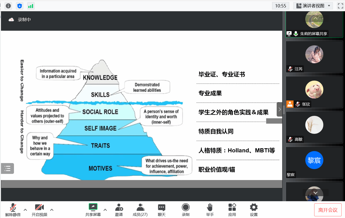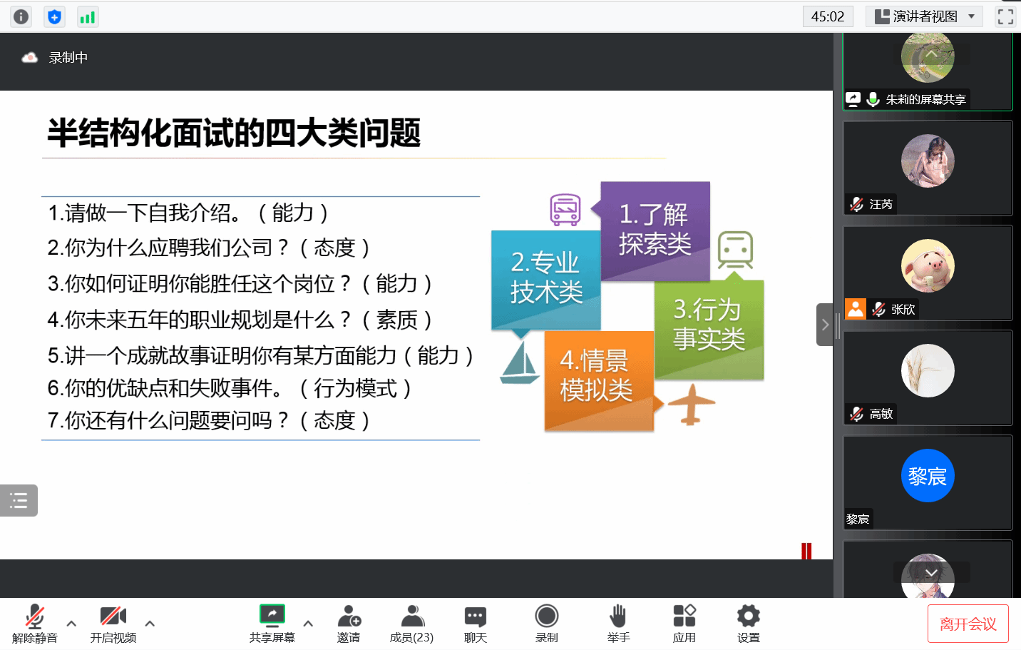 应学院邀请,学校学生职业发展指导服务中心朱莉老师给大四学生带来了一场“简历面试,通关秘籍”为主题的专题讲座。朱老师强调,同学们在找工作之前应该先挖掘自己的价值,包括专业成果之类的外在价值,以及职业价值观等内在的价值。朱老师还提出,学生在求职过程中需要探索七种潜在能力,信息收集与分析、学习发展等基本能力用于帮助适应岗位,行动力、责任心与专业化等能力辅助胜任岗位,建立良好的职业关系则有助于实现岗位跃升。最后,朱老师讲解了求职面试的基本问题和回答思路,针对面试的四类问题,建议大家在面试前围绕每一类准备20个左右常见问题及答案,找同学或朋友进行模拟面试,提高自己的面试能力和勇气。