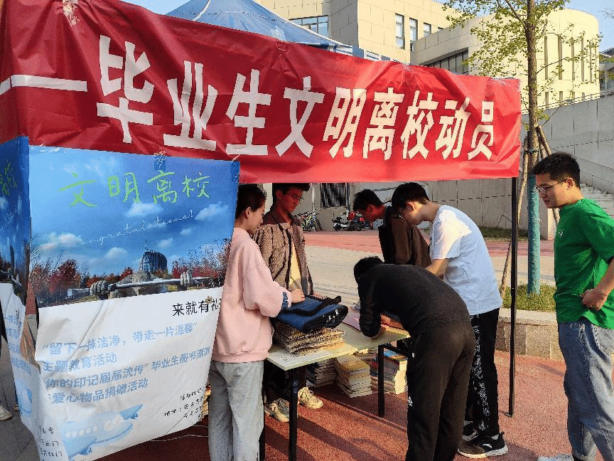 此次文明离校动员活动地点分别设在海天苑餐厅西门、云天苑餐厅北门以及大超北门,内容包括条幅宣传、签写文明离校倡议书和分发行李打包袋等,希望营造和谐友爱的学生氛围与整洁温馨的校园环境,文明离校、有序离校,展现2023届毕业生良好的精神风貌。
