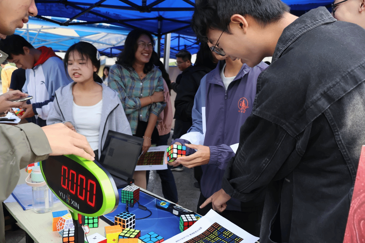 活动现场还设置了丰富多彩的福利和互动环节。参与者按照图纸复原魔方所用时间小数点最后一位为“1”、“2”、“5”、“7”的同学有机会抽奖获得精美礼物。同学们热情高涨,展现了高超的魔方技巧,同时期待着自己复原所用时间,为活动现场增添了许多乐趣。