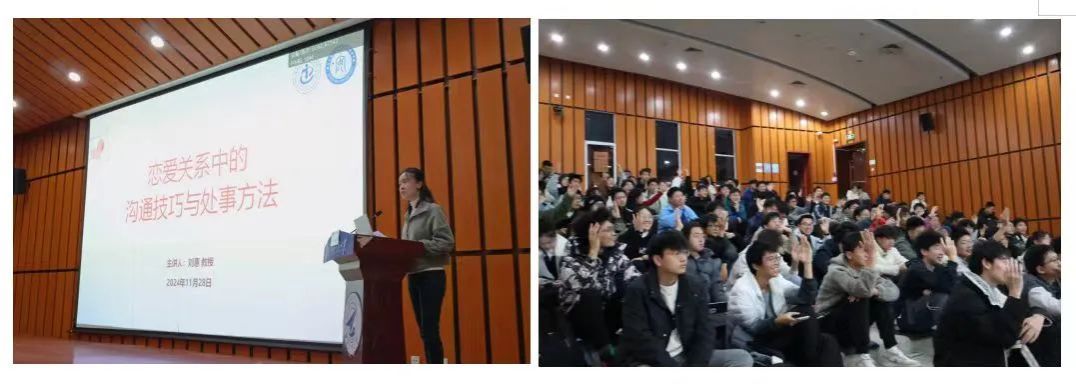 在讲授过程中,刘教授通过现场互动、故事人物分析、引入爱情语言等多种方式,引导同学们了解男生和女生对待爱情的差异,使大家更加清晰地了解自己的恋爱价值观,帮助同学们掌握正确的感情交流方式。“小工和小西”的爱情故事更是身临其境的带领同学们体验校园爱情的过程,并着重论述当代大学生怎样爱才算对、如何拥有健康的亲密关系,并就失恋问题应对给出了恰当的心理调节方式,解决了同学们在恋爱中可能存在的困惑。