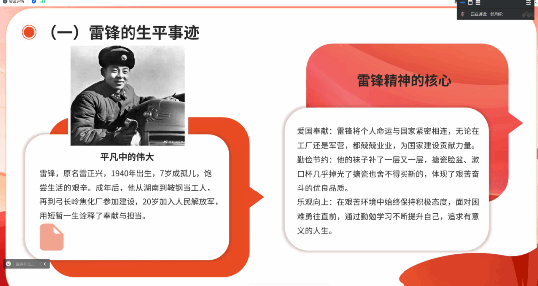 2025年3月5日是第62个“学雷锋纪念日”,也是第26个“中国青年志愿者服务日”。为了传承雷锋精神,学生信愿志愿者服务队三月团日活动以学习雷锋精神为主题顺利展开。团支书郭月好针对雷锋事迹和雷锋精神进行讲解,并讲述了当下先进青年志愿者事迹。会议中郭月好提到服务队队员要响应党的号召,积极践行雷锋精神,将雷锋精神发扬光大。