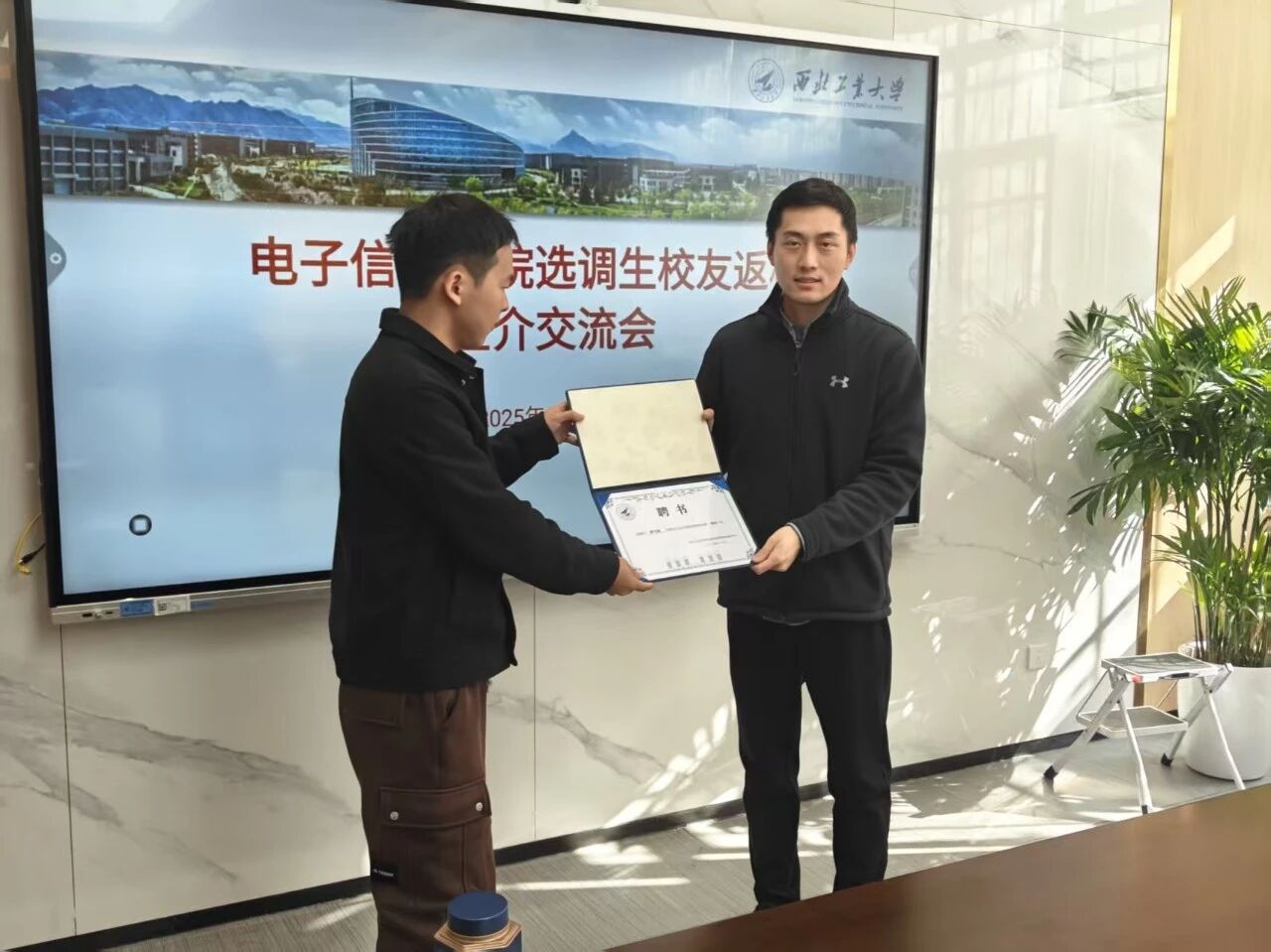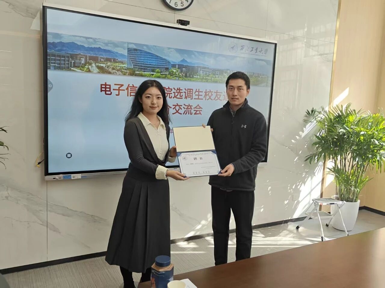 活动伊始,史越介绍参会人员,代表学校聘任何明遥、何飞龙为永利集团校外职场导师,并赠送纪念品。在随后的校友发言中,何明遥以扎根北疆沃土,践行工大精神为题从三个方面与大家进行交流分享,从母校理论课程的系统学习、工程实践的深入参与,到科技一线,掌握各级科技政策,持续提升创新意识和业务工作能力,再到扎根基层乡镇,走向广袤田野,和村干部一同入户,讲政策、听意见、找办法、解难题。她始终铭记母校“公诚勇毅,三实一新”的校训,勇担责任、砥砺前行,向下扎根、向上生长,用奋斗诠释初心,努力交出一份属于西工大人的时代答卷。何飞龙则从具体选调生问题出发,以自身见闻出发,更加具体地回答同学们所遇到的问题。