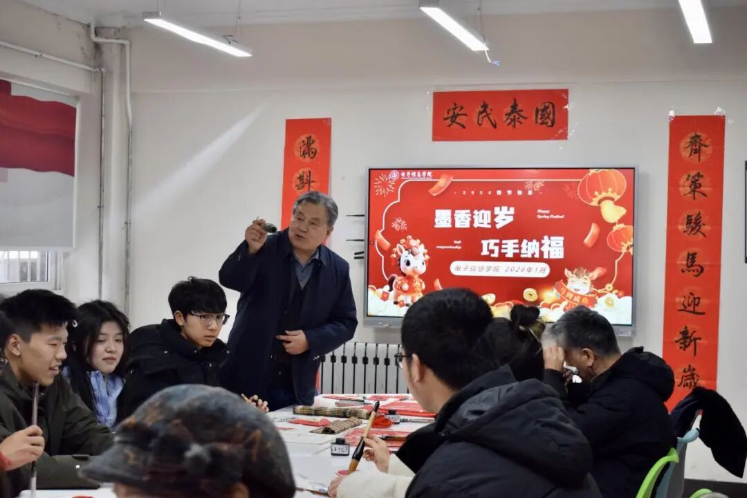 在手写红包与春联区域,墨香袅袅升腾,书法爱好者们凝神静气、挥毫泼墨,笔走龙蛇间,“国泰民安”“龙马精神”等吉祥字样跃然纸上,师生们纷纷根据自己的心意定制祝福,有的在红包上写下对家人的牵挂,有的为挚友送上前程似锦的祝愿,还有的将电子信息专业特色融入春联创作,构思巧妙、别具匠心。写好的春联与红包整齐晾晒,墨香与年味交织,成为冬日里最温暖的风景。