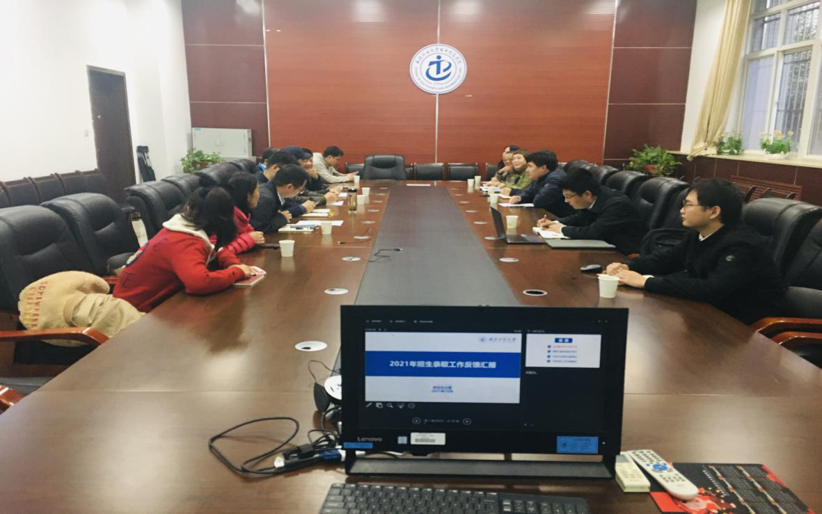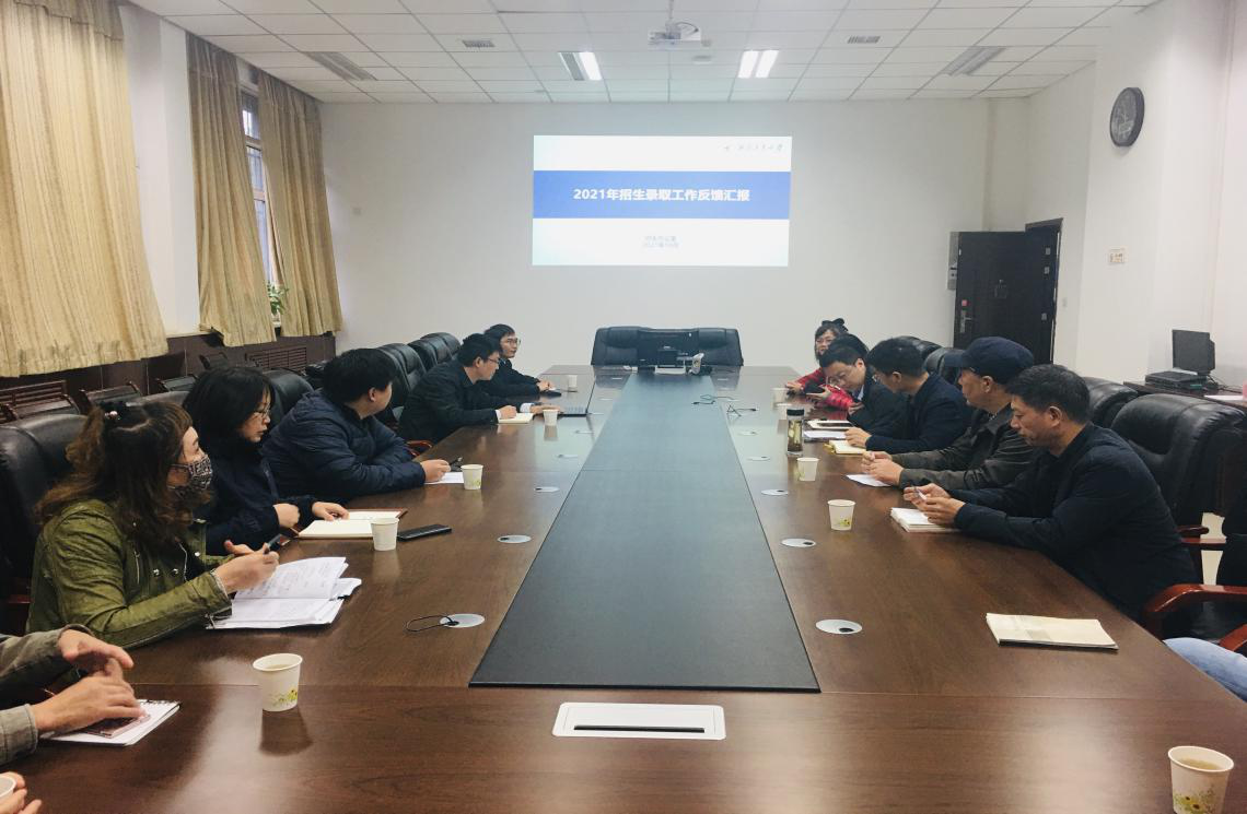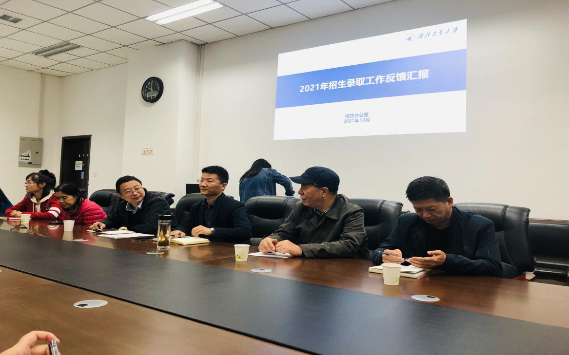 反馈会开始,彭亮代表学院对招办一行表示欢迎。招生办张懿鑫老师介绍了2021年77779193永利官网集团负责的浙江省、贵州省和咸阳地区的招生录取情况,以及招生组的日常和集中外出阶段招生宣传工作情况,指出学院所负责的“两省一市”的招生位次在2021年稳中有升。