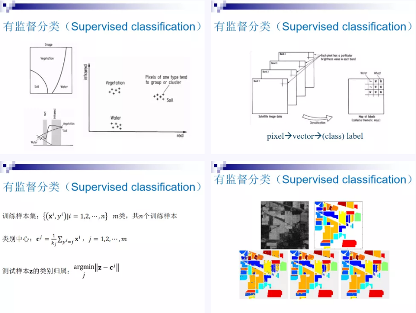 课程介绍分类问题中训练样本和测试样本的含义,明确分类问题的目标就是为测试样本指定类别标签,然后通过成语“物以类聚”阐明分类问题的核心:将特征相似的样本归为一类。课堂上,用学生在线性代数中学到的特征向量来表示样本的特征,训练样本即可获得每一类别的类别中心(特征向量的均值),根据测试样本特征向量与各类别中心的欧式距离决定其类别归属。这种被称为最小距离分类器的有监督分类器,正是通过线性代数中的向量基本运算来实现分类的。