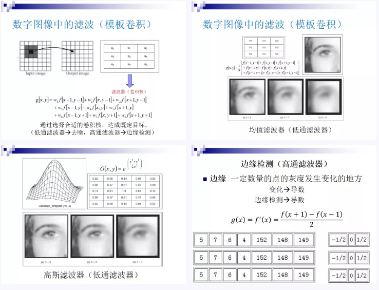 在这个内容中,首先介绍数字图像处理中基于模板卷积的滤波计算过程,通过选择合适的卷积核,可以实现既定目标的滤波。然后,选择均值滤波器和高斯滤波器这两种典型低通滤波器,阐述其卷积核的构造和特点,并通过示例展示其滤波结果,明确其邻域加权和的数学及物理意义。与学生讨论边缘的定义、一维函数一阶导数的几何意义,得出数字图像中的边缘检测可以通过计算相邻像素灰度值的变化情况来实现的结论,从而引出一阶边缘检测算子(高通滤波器),并通过示例明确其高通滤波的运算效果。