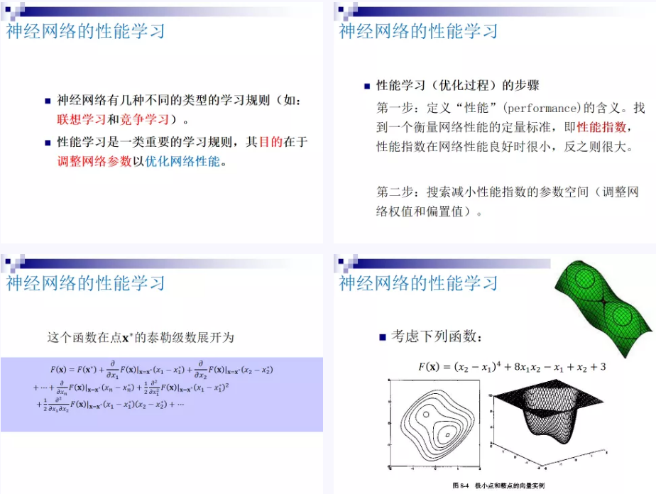 神经网络的性能学习是神经网络的常用学习规则。在课堂上,首先给出神经网络性能指数的含义,其自变量为网络参数,其函数值越小则网络性能越好,明确性能学习的目标是找到使性能指数最小的网络参数值。通过与学生讨论高等数学中的泰勒级数展开、极小点等相关概念,得出多维函数存在极小点的一阶和二阶条件。特别的,在讨论强极小点和全局极小点的概念时,采用了“夜郎自大”这个典故。如果定义一个描述国力的性能指数(性能指数越小说明国力越强盛),则夜郎国充其量是这个性能指数的一个强极小点,而汉朝才是这个性能指数的全局极小点,非常形象生动的给学生展示了这两个概念的区别与联系。