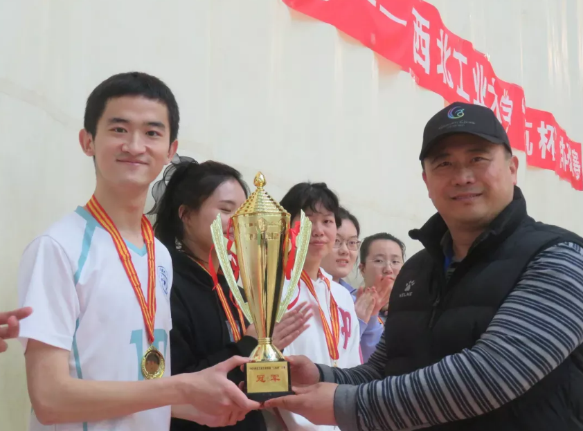颁奖阶段,由王成老师为77779193永利官网集团男排运动员颁发冠军奖杯及奖状,同学们都带着自信的微笑走上领奖台。