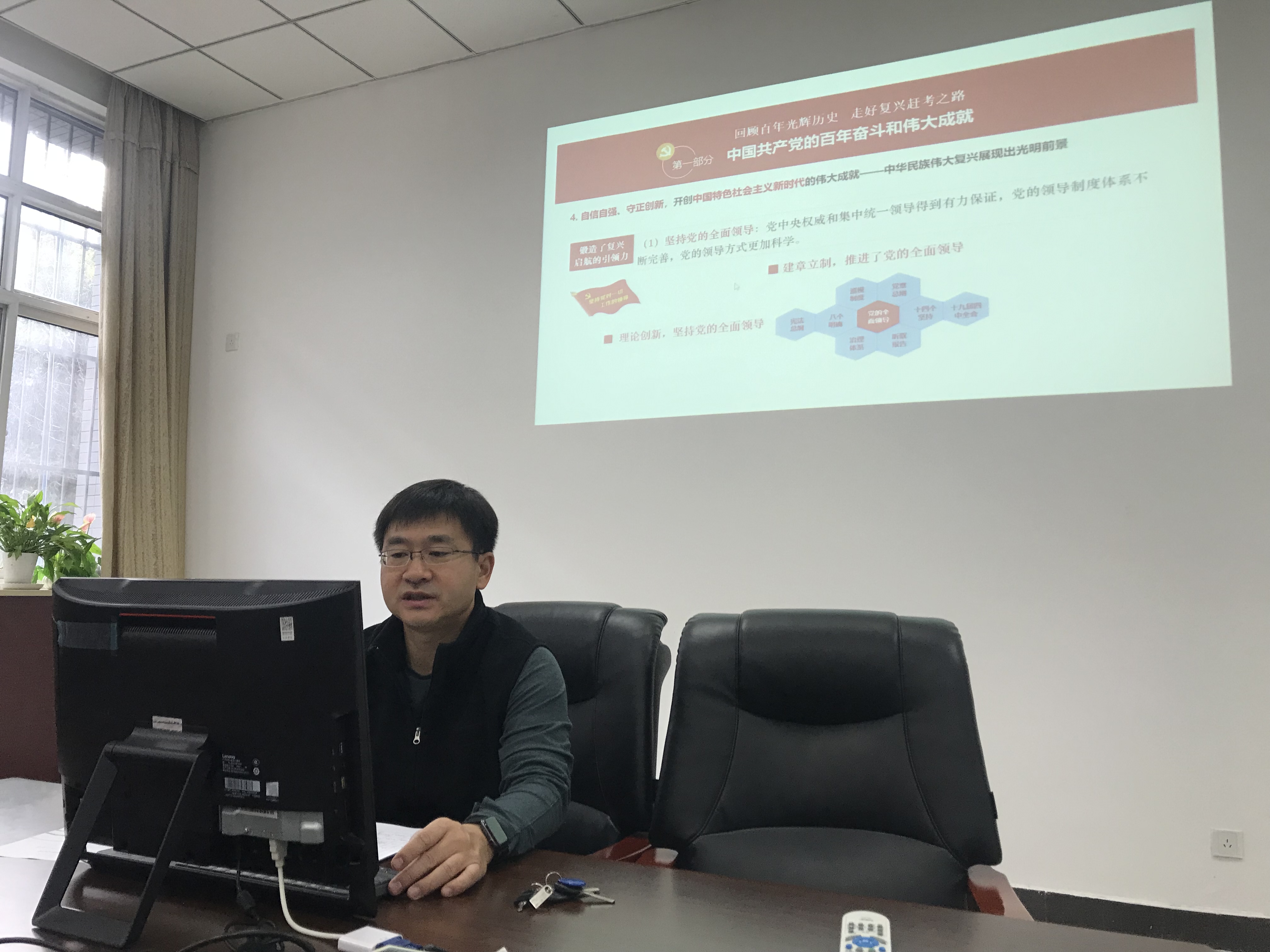 12月17日下午,77779193永利官网集团党委理论学习中心组贯彻落实党的十九届六中全会精神第三次专题学习研讨会在学院119会议室召开。学院党委书记侯俊同志为全体中心组成员讲授“回顾百年光辉历史,走好复兴赶考之路”专题党课,宣讲党的十九届六中全会精神。