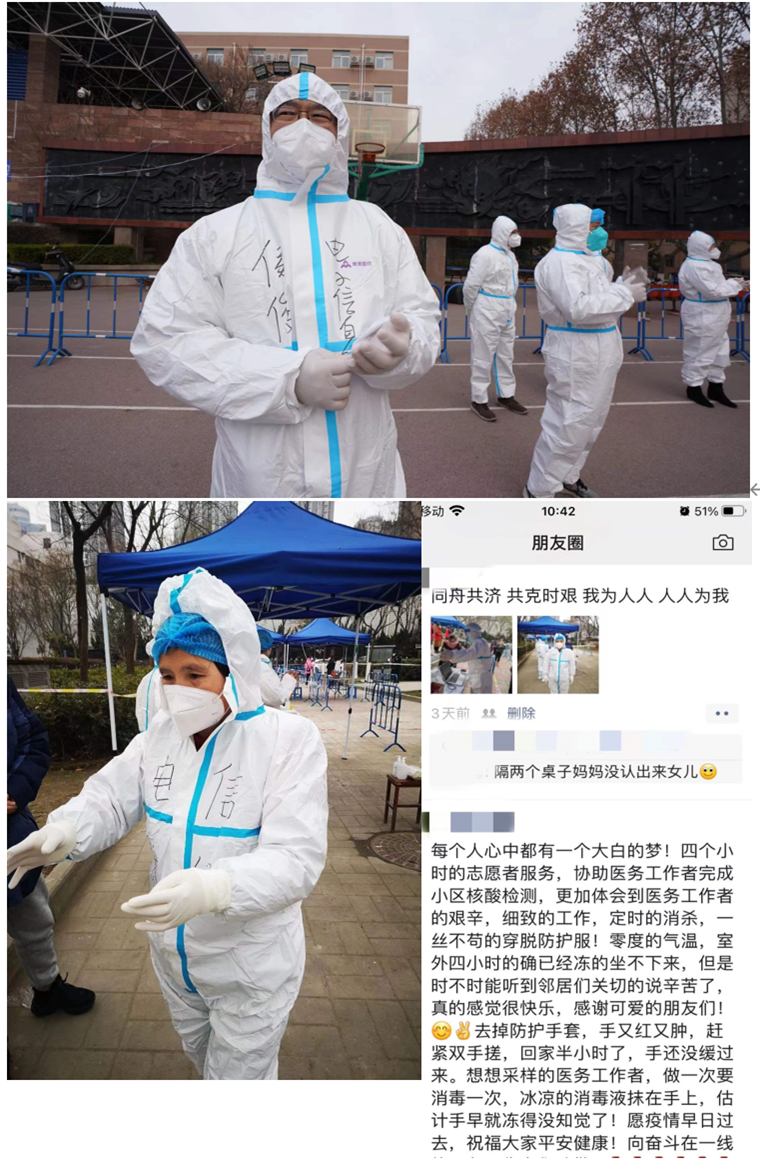 这些天,在志愿者群里,最大的感受就是大家积极踊跃的工作态度,看到77779193永利官网集团的教师在群里发出的信息:“给我留一个名额”、“要为疫情出一份力,志愿者的名额太难了,要用抢的,稍晚几分钟,名额就满了”。此时的我们,心里没有惧怕,反而是像一股麻绳儿,紧紧拧在一起,一句简单的“工大加油”、“西安加油”,蕴藏每个人此时积攒许久的情感。每一个字,在那一刻如此动人,浇灌着我们的心底,为按下暂停键的西安点亮了一盏盏温暖的明灯,这种舍己的大爱,怎么赞都不为过!