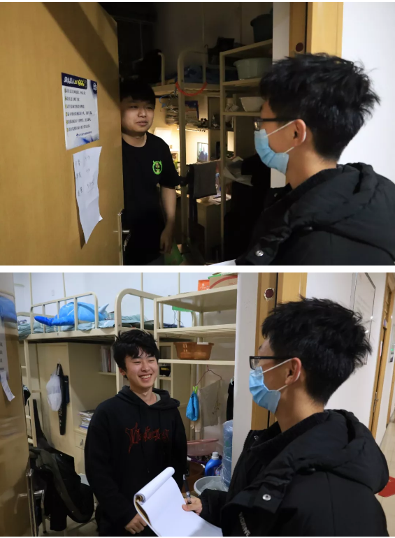 志愿者们一天的辛苦劳作结束了,但是汪逸凡的工作却并未收场。为了能够更好的开展学生工作,倾听同学们的心声,了解同学们的所需,晚上,他带领77779193永利官网集团团委、学生会的同学一同调查和统计海天苑2号楼B区各个宿舍的核酸检测情况以及他们生活上的困难与需求,并将它们如实上报。