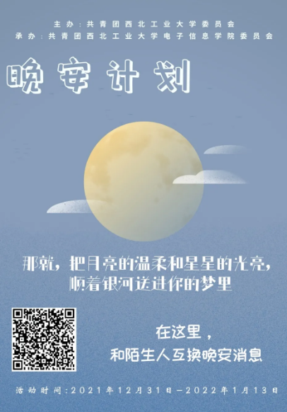 2021年12月31日至2022年1月13日,“工大晚安计划”风雨无阻,将继续陪伴在你的身边,期待更多的小伙伴加入我们,分享你的心情和故事,互相温暖彼此。