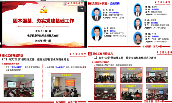 最后,侯俊对参会的各位评委老师和学生党支部书记表达感谢,对各位学生党支部书记在过去一年的工作表示充分肯定,也希望各党支部书记能够利用好这次互相学习、互相借鉴的机会梳理解决好支部目前存在的问题与不足,然后对大家即将在2022年的工作提出了三点要求:一是希望大家能够提高政治站位,加强理论学习,发挥好党员的先锋模范作用,带领党支部不断创优争先,争取“更上一层楼”;二是希望大家能够充分调动支部成员的主动性和积极性,将党建与科研学习紧密结合起来,以高质量的党建引领学风建设;三是希望大家能够充分结合自身所在支部的实际情况,不断创新支部开展活动的形式,提升党建工作质量。