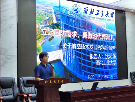 授牌仪式之后,西工大航空学院沈将华教授为长兴中学学生举行了题为“立足国防需求,勇做时代弄潮儿——关于航空技术发展”的科普报告。报告由长兴中学孔启宏副校长主持。