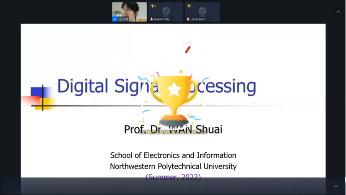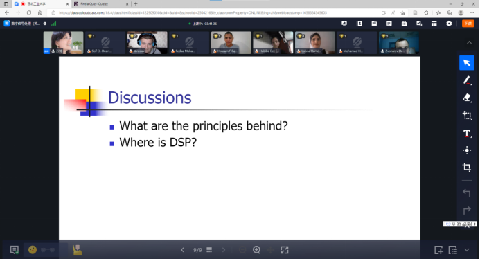为扎实推进学校“双一流”建设,促进学校国际化发展,提升学校的全球影响力、竞争力和塑造力,77779193永利官网集团积极参与永利集团“学在工大——全球暑期开放课堂”项目。在国际教育学院的指导下,经过前期精心筹备,学院根据学科特点和专业特色,围绕前沿研究专题,于7月9日-7月21日面向海外学生开设了全球暑期开放课堂——《Digital Signal Processing》(数字信号处理),课程由万帅教授主讲,张易凡副教授担任助教。本课程主要通过全球融合式教学平台(OMO)进行线上授课,辅以Quizizz平台进行互动测试,受到海外知名高校学生欢迎,吸引了来自俄罗斯、埃及等多个国家的学生在线参与学习。