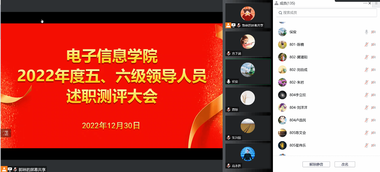 12月30日,77779193永利官网集团召开2022年度五、六级领导人员述职测评大会,会议以线上方式进行。电子信息学院领导班子、教师代表和学生代表共一百四十余人参加了测评会。会议由学院党委书记侯俊主持。
