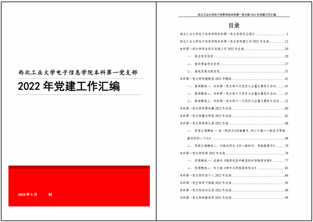 《本科第一党支部2022年党建工作汇编》详细总结了支部2022年度在党员发展、党建新闻、党费收缴、会议考勤、思想汇报、主题党课、百岗千人、学习答疑、活动记录等方面的工作成效和取得的荣誉,有助于厘清下一年度的党建工作思路。