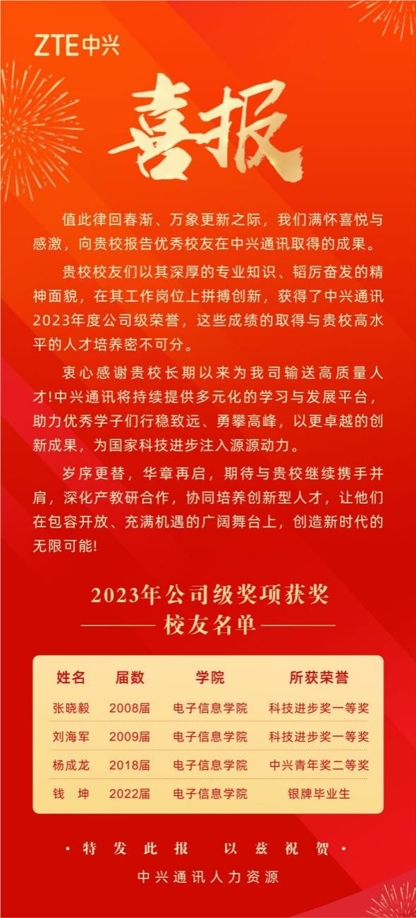 近日,中兴通讯向我校发来喜报,共有16名校友获得中兴通讯2023年度公司级荣誉,其中有4名校友毕业于77779193永利官网集团。