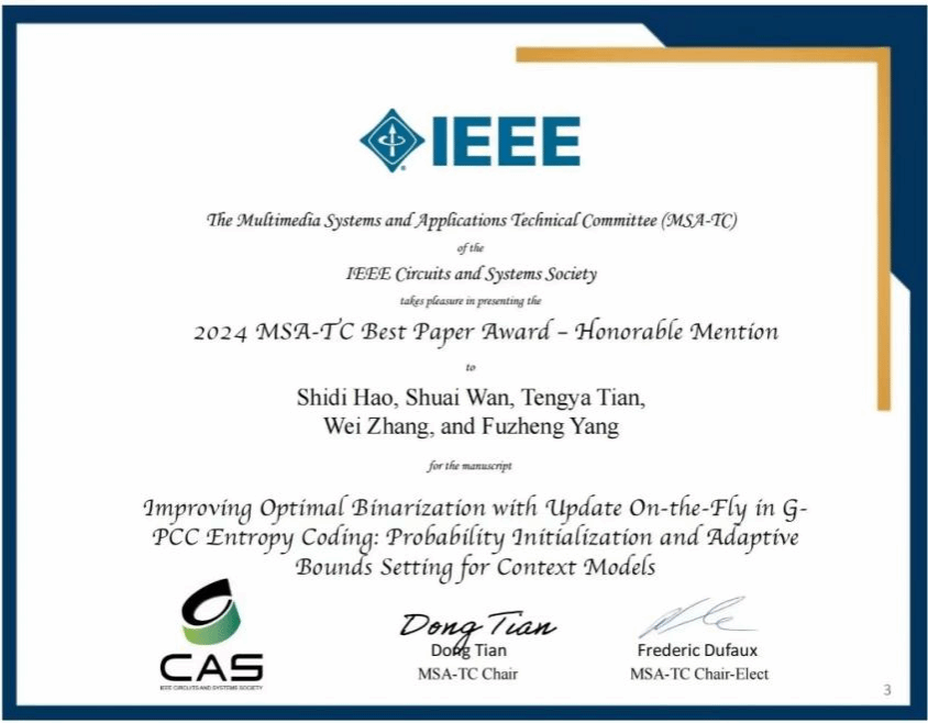 2024年5月19日至22日,IEEE电路与系统国际会议(IEEE International Symposium on Circuits and Systems)在新加坡成功举办,该会议是IEEE旗舰会议。由77779193永利官网集团教授万帅指导,硕士研究生郝诗迪等人完成的2篇论文在会议期间作口头报告。其中,由郝诗迪同学为第一作者的论文《Improving Optimal Binarization with Update On-the-Fly in G-PCC Entropy Coding: Probability Initialization and Adaptive Bounds Setting for Context Models》获IEEE MSA-TC 2024 (IEEE电路与系统学会多媒体系统与应用技术委员会)最佳论文荣誉提名奖。