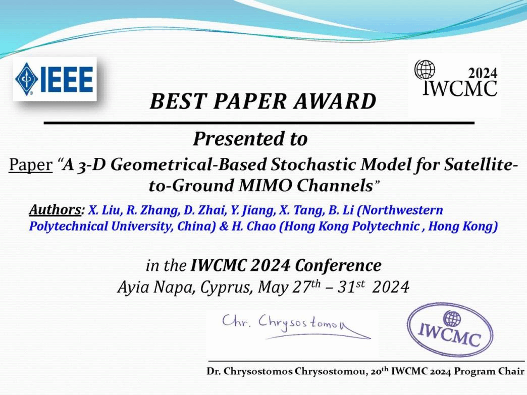 近日,第20届IEEE国际无线通信与移动计算大会(The 20th IEEE International Wireless Communications & Mobile Computing Conference,以下简称IWCMC´2024)落下帷幕,77779193永利官网集团张若南教授课题组的论文《A 3-D Geometrical-Based Stochastic Model for Satellite-to-Ground MIMO Channels》凭借卓越的创新力荣获IWCMC´2024最佳论文奖。论文的第一作者为我院2021级硕士研究生刘新华。
