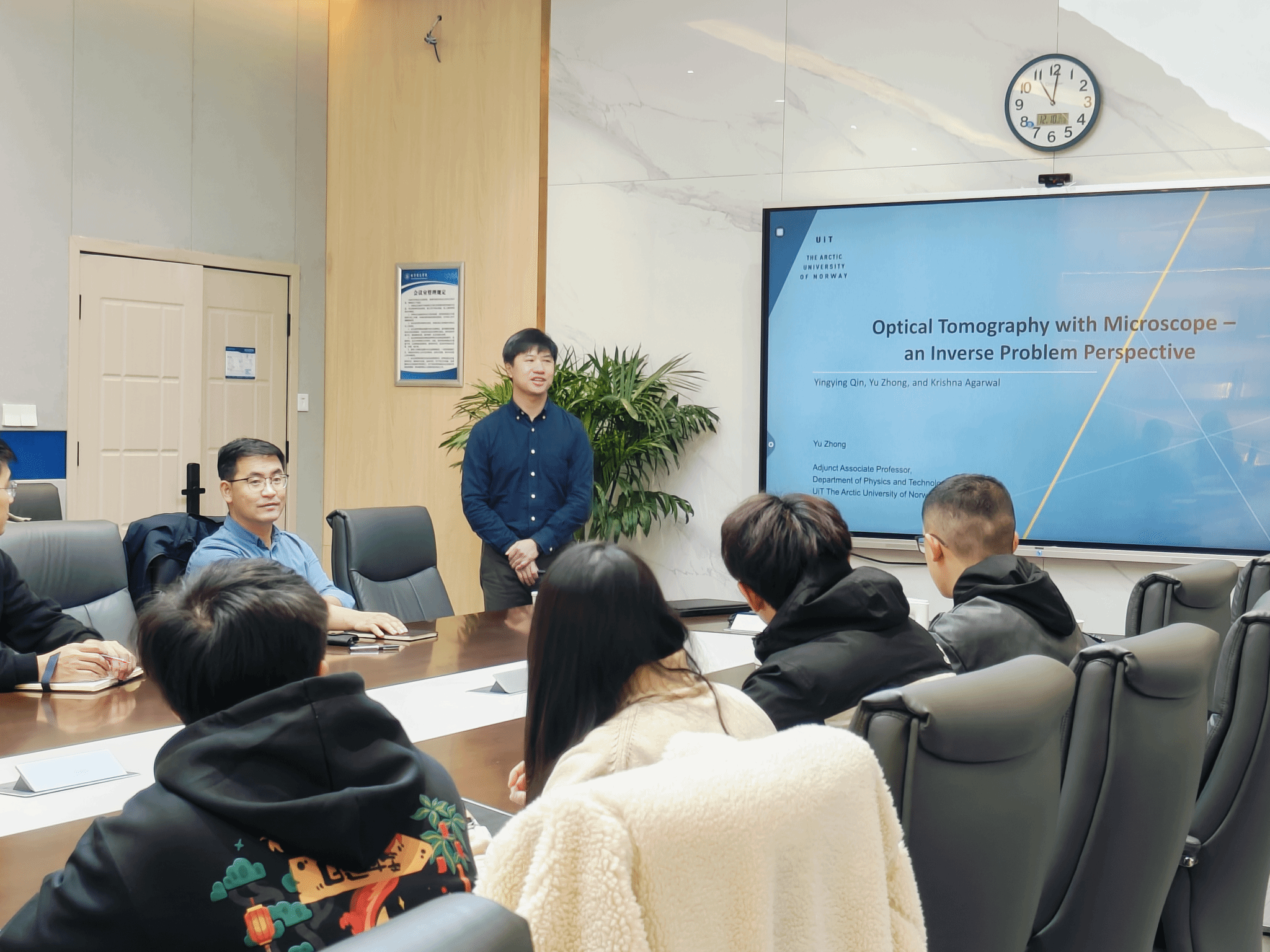 论坛伊始,李长侑副教授对钟昱副教授的到来表示了热烈欢迎,并详细介绍了其个人履历及研究方向。随后,钟昱副教授做了题为《显微镜光学成像——逆问题视角》的专题报告。钟昱副教授介绍了超分辨率光学显微镜成像中常用的方法及应用,分享了从逆问题的视角解决光学生物成像问题的相关研究进展,并结合团队长期深耕的工作,重点阐述了应用多种逆问题数值方法解决光学生物成像问题的新思路与新突破。