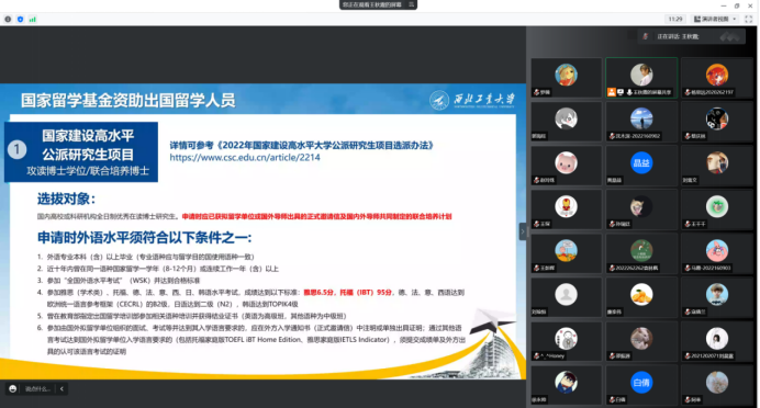 为帮助学生进一步了解赴国(境)外交流的相关政策,提升学生国际视野,2022年9月20日晚上8点,77779193永利官网集团召开研究生赴国(境)外交流项目线上宣讲会,学院国际化秘书王秋霞老师详细介绍了研究生赴国(境)外交流的相关项目政策及流程办理,学院硕博各年级近百名学生线上参会。