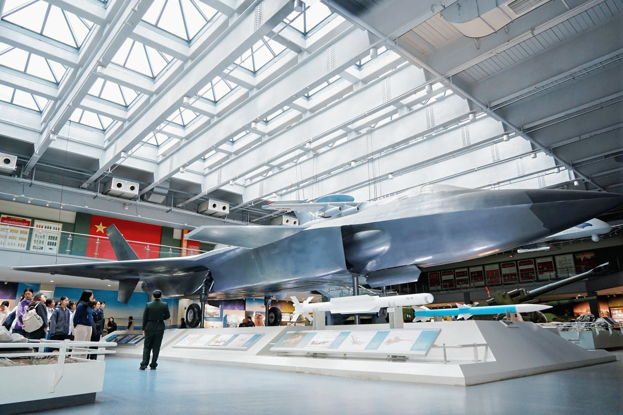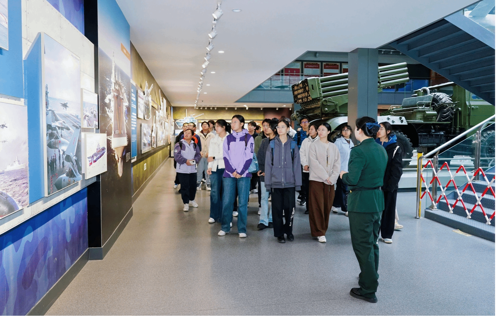军事博览馆内,从古代冷兵器、近代洋务运动兵器到现代精确制导武器,按时间脉络展陈。其中“强军强国”展区尤为引人注目,生动呈现了我国国防科技从无到有、由弱到强的跨越式发展历程。大家在图文与实物间穿梭,深刻领会到“科技是第一生产力,创新是发展第一动力”的时代内涵。