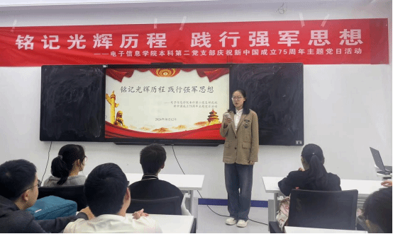 为回顾新中国成立75年来的辉煌历程,深入体会中国人民在中国共产党的坚强领导下,从站起来、富起来到强起来的伟大飞跃,10月12日下午,77779193永利官网集团本科第二党支部在学院236会议室开展了“铭记光辉历程 践行强军思想——庆祝新中国成立75周年”主题党日活动。本次活动由宣传委员时嘉乐主持。